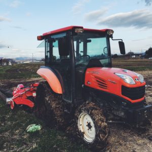 畦(あぜ)塗り機をトラクターへ装着し、田んぼと田んぼの間に土を持っていきます。