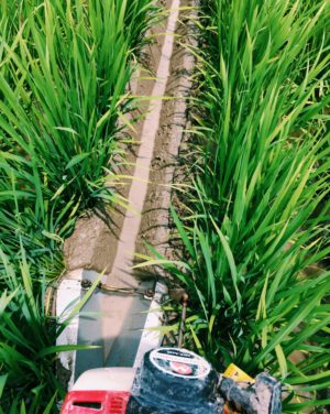 こんな感じに田んぼに溝を掘り、水はけを良くして中干し(田んぼを一度干し、根張りを促し根の活力を高めることを目的とする)を助けます。