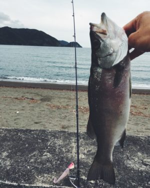 10投ほどキャストし、波打ち際でバイト!!食べても美味しいヒラスズキをゲット!