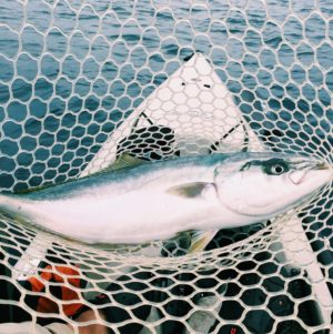 魚探には明らかに青物が盛んに餌を捕食している動きが見られ、その後3回青物が掛かり、その度に逃しと痛い動きが続き、4度目の正直、死闘40分ほど、相手を弱らす作戦が見事功を奏しついに引き上げました!
