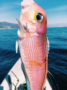 おっ、これはアマダイ特有のあたりだ!仕掛けを回収している間も定期的に力強い引きを楽しめます。