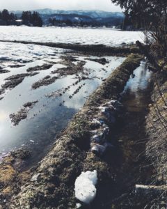 田んぼ横の小川の流れも日増しに強まり、雪が本格的に解け始めたことを実感。