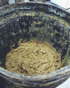 米を蒸し、麹菌を加え混ぜて保温し米麹を作り、鍋でよく洗った大豆を煮込み、すり潰した後に米麹と塩を加えしっかり混ぜます。